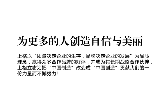 • 上格一路走來,以“締造時尚集團,使公司受人尊敬,令人向往;為客戶提升價值,創造成功;讓員工提高生活品質,實現自我價值”作為我們的目標,“為更多的創造自信與美麗” 作為我們的使命,立志為把“中國制造” 改變成“中國創造”貢獻我們的一份力量而不懈努力!